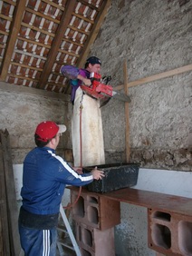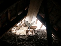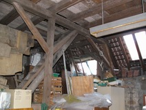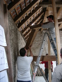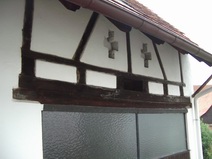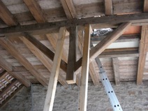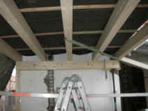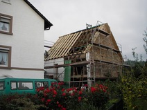 | Der Fachwerkriegel über der Garageneinfahrt kann leider nicht weiterverwendet werden. | Einbau der Decke über der Garage | Teilweiser Abbau der vorhandenen Holzkonstruktion | |