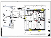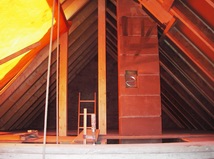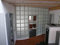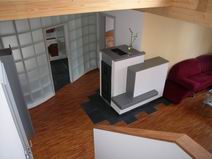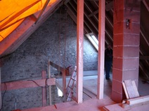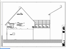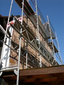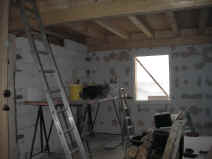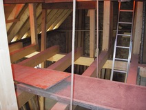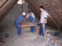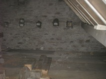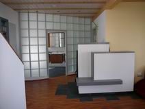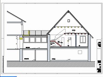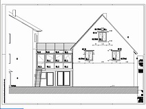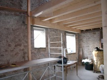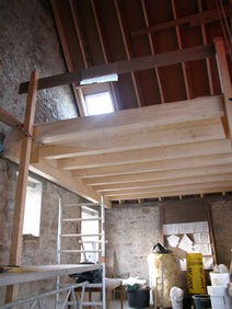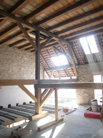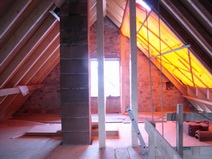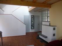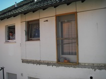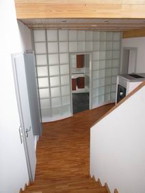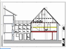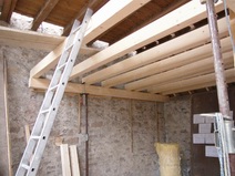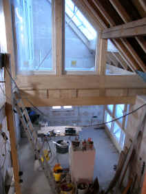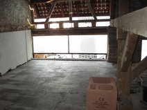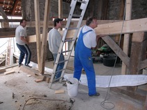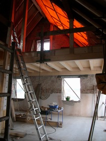 | Die Fensterdurchbrüche erhalten kombinierte Stahl- / Stahl- betonstürze mit außen sichtbaren verzinkten I-Trägern. Sorgen bereitet das Durchbrechen der sehr inhomogenen Wände. | Die Planung sieht vor, dass die vorhandene Balkenlage gereinigt und ca. 1,40m tiefer wieder eingebaut wird. Die Erschließung dieser Empore erfolgt über eine massive Treppe mit Brüstungen. | Im Dachgeschoss entsteht eine großzügige Dachterrasse. Alle wärmedämmenden Fenster sind mit Rolläden versehen. Auf der Süddachfläche wird eine ther- mische Solaranlage angebracht. | Nach