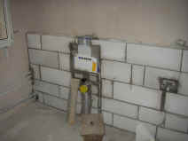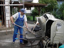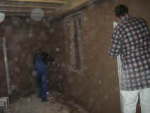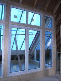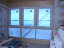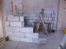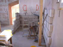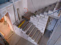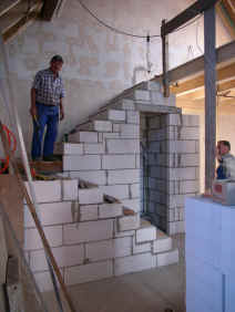 | Die Kunststofffenster in der Scheune und im Wintergarten werden eingebaut. | Die Treppe wird angelegt und aus aus Gewichtsgründen aus Porenbetonfertigstufen gemauert. | ||