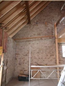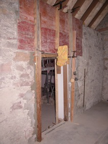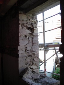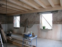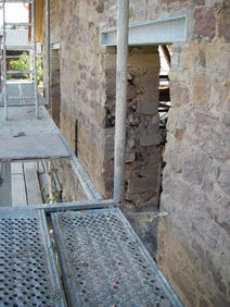 Festeröffnungen sind ausgebrochen, die Laibungen geglättet. Die obere, alte Balkenlage ist jetzt ausgebaut und damit der spätere Raumeindruck erlebbar. |