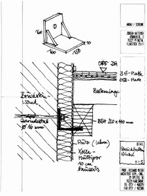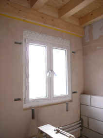 | Fensterdetail mit Sturz und Rolladen | Zum Glück gibt es jemanden, der die Fensteröffnungen erschütte- rungsfrei aussägen kann | Detail für die Befestigung der Streichbalken vor der Innendämmung | |